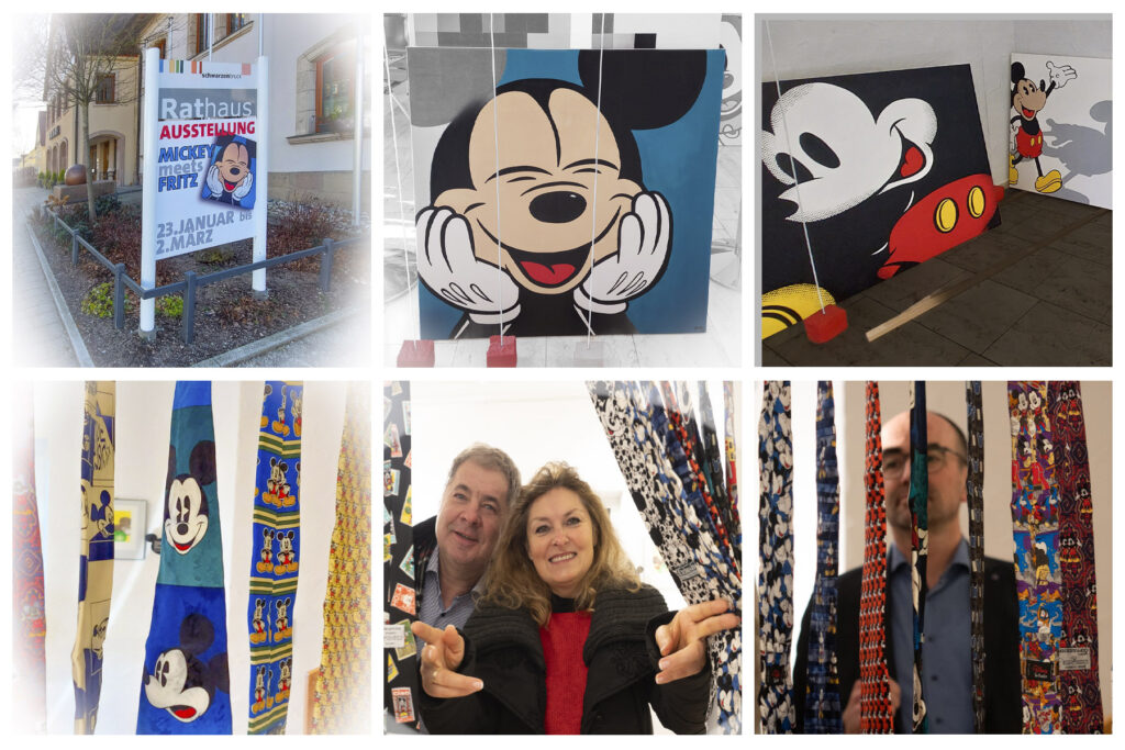 Von Airbrush-Mäusen bis zu großen Acryl-Interpretationen ist alles dabei. Und wie wichtig Mickey im Leben von Fritz Schneider war und ist, zeigt auch eine Auswahl von Mickey-Mouse-Krawatten, die ihn auf seinem Berufsweg begleiteten.